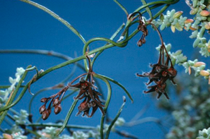 A delicate vine with dark slender leaves, tiny yellow flowers and long, cylindrical seed pods and silky-tufted seeds. Climbs to 3 metres tall and likes sandy, well-drained soils.